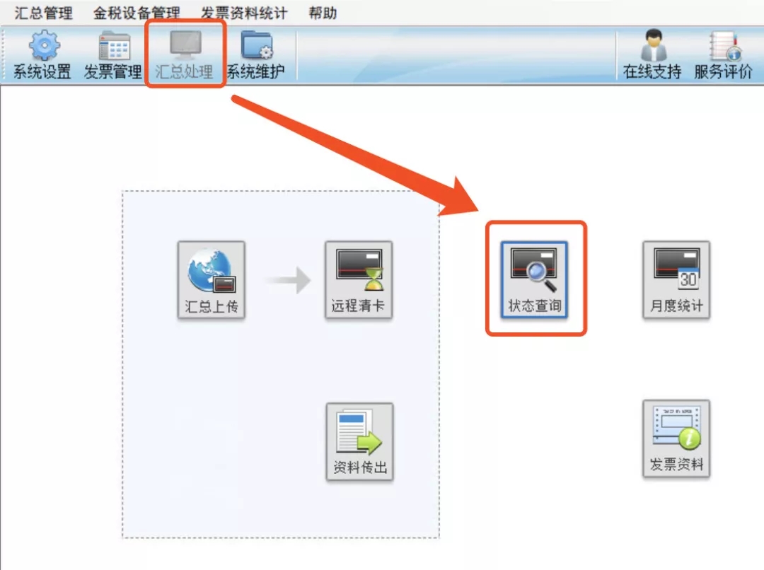操作流程:點(diǎn)擊【匯總處理】-【狀態(tài)查詢】-【增值稅專用發(fā)票及增值稅普通發(fā)票】。